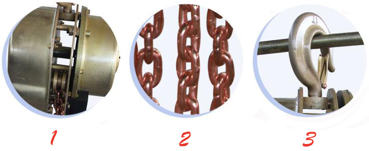 2、手拉链条采用H62黄铜材质,起重链条采用20Mn2钢链条镀镍铜合金材料,链条摩擦不会引起火花发生爆炸等不良反应。