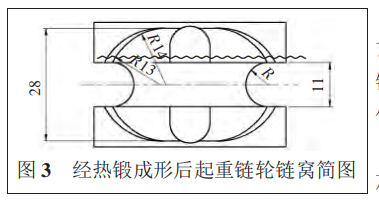 热锻成形工艺吸取了球铁件链窝一次成形的优点及合金钢材料切削加工链轮具有较高的疲劳强度、不会断裂等优点。合金钢材料经中频磁感应炉的恒温控制,经热锻成形模在经改造后的压力机上一次成形,就得到了理想的起重链轮链窝形状。